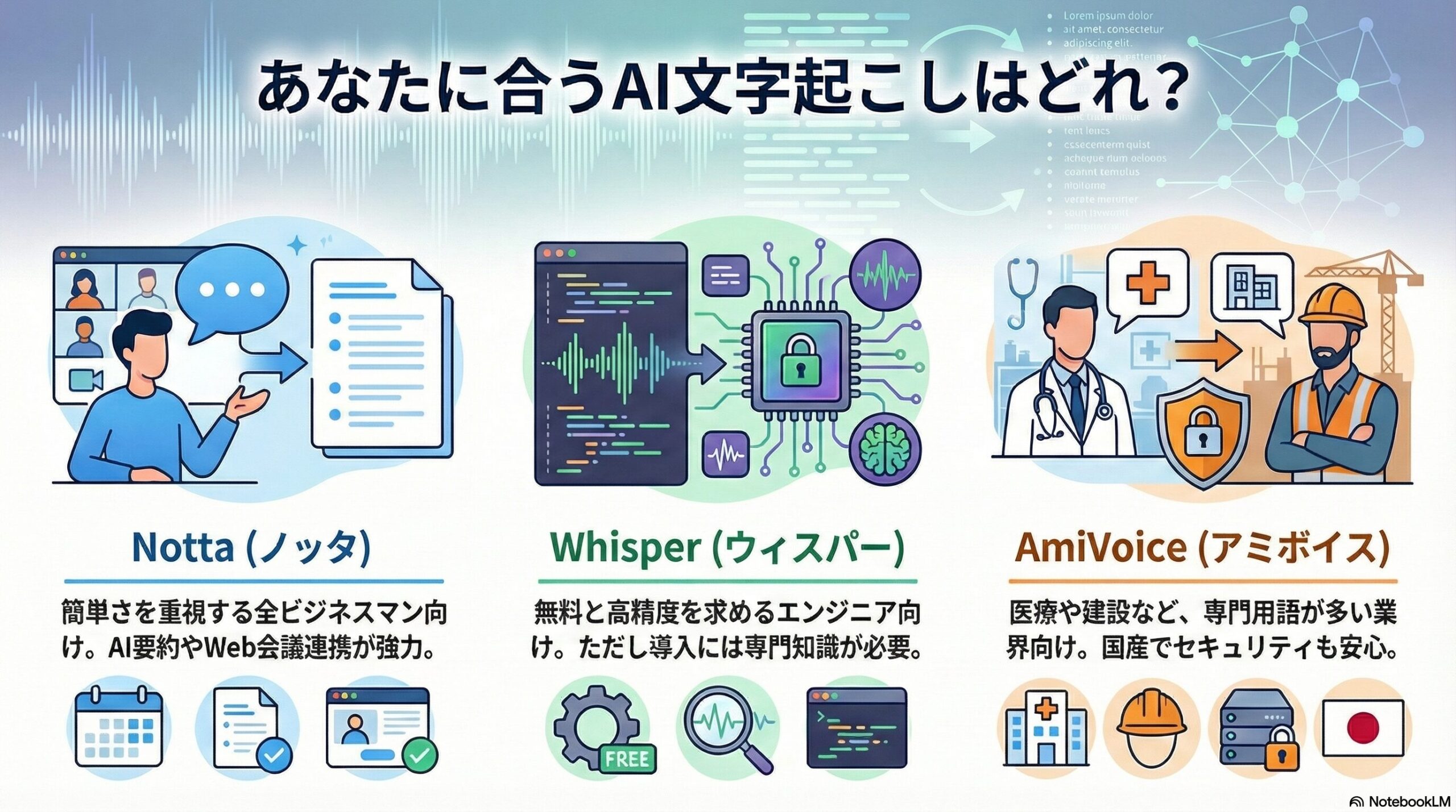 【2025年版】AI自動文字起こし徹底比較!Notta vs Whisper vs AmiVoice 精度とコスパで選ぶならどれ?